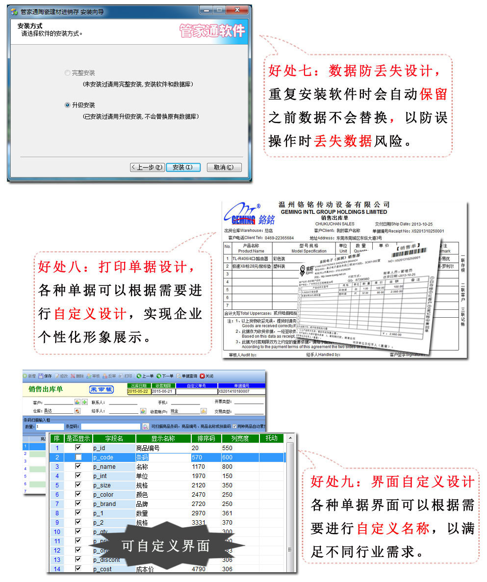 管家通陶瓷建材進銷存是一款專業的瓷磚銷售管理軟件,針對陶瓷建材行業的特點設計,如瓷磚的色號管理,其中包含商品銷售管理系統 ,庫存管理系統(倉庫管理系統),財務和報表系統等子模塊。軟件界面設計簡潔,美觀,其人性化的軟件流程,使普通用戶不需培訓也能很快掌握軟件操作使用方法,上手極易。強大報表與集成查詢功能是本軟件的最大特色,所有功能在用戶需要的使用地方自然體現,不用打開多個窗口重復查詢。管家通進銷存軟件廣泛適用于企業,商貿公司,個體門店等用于商業銷售管理, 庫存管理,財務管理等,客戶管理,員工管理等場合,是您企業進行信息化管理的強大工具。