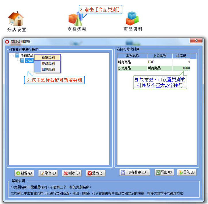 操作說明:在導航【基本信息】模塊中點擊【商品類別】打開如圖所示,在左邊類別上面點擊右鍵后出菜單,直接添加新類別,下級類別等,輸入分類的名稱即可。