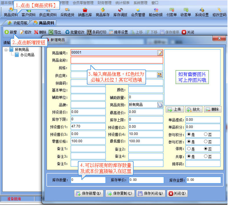第2步:建立商品資料,建立好商品資料后可以供進貨,銷售出庫時調用,【基本信息】--【商品資料】打開如圖所示的窗口