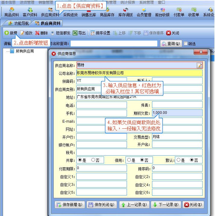 第3步:建立供應商資料,建立好供應商資料后可以供采購訂單,采購進貨單上調用,即和你供貨的對象,【基本信息】--【供應商】打開如圖所示的窗口