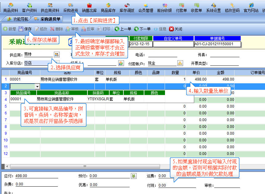 該單貨物從哪個供應商處購買,相對應的欠款等也會自動增加到該供應商上。 |