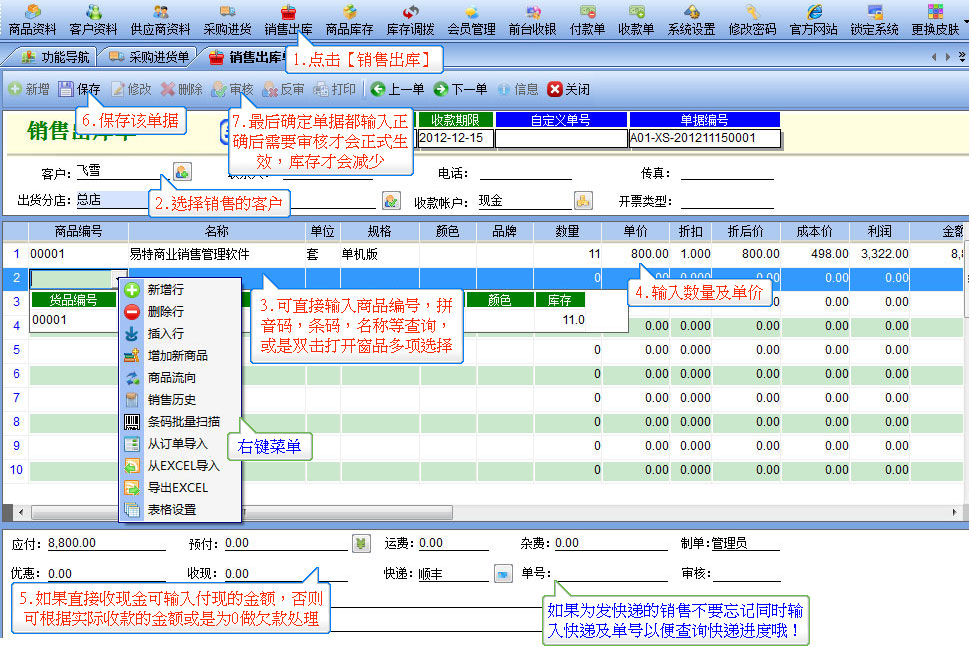 第7步:銷售出庫,將東西賣出去,需要做銷售出庫處理,可以直接點擊工具欄上銷售出庫按鈕打開如圖所示的窗口