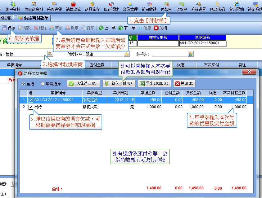 第6步:采購付款,如果之前采購進貨未付現金,現在需在付款給供應商時,需要做采購付款處理,可以直接點擊工具欄上付款單按鈕打開如圖所示的窗口