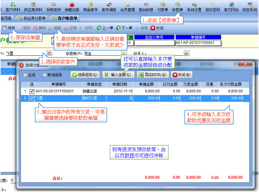 選擇需要收款的客戶,會自動彈出該客戶的欠款單據明細。 |