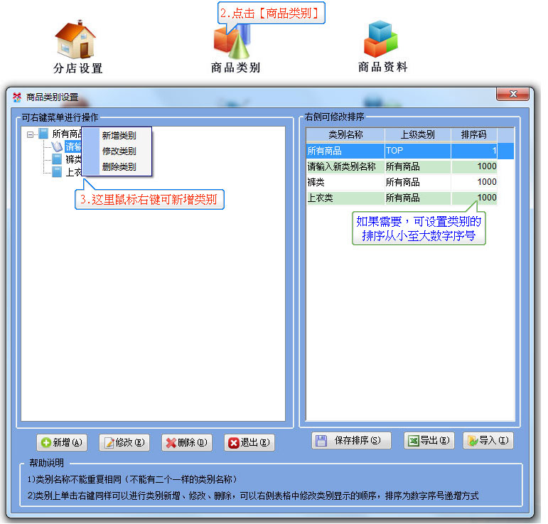 第1步:建立商品類別,系統中的商品資料需要有一個分類的管理,可以分成若干個類別,可以按不同的同產品來分,如上衣類,褲類,內衣等都是一個產品屬性分類方法,可以根據自己的產品來分類,以方便在所有用到商品的地方可以點擊分類快速顯示該分類下面的所有商品信息。