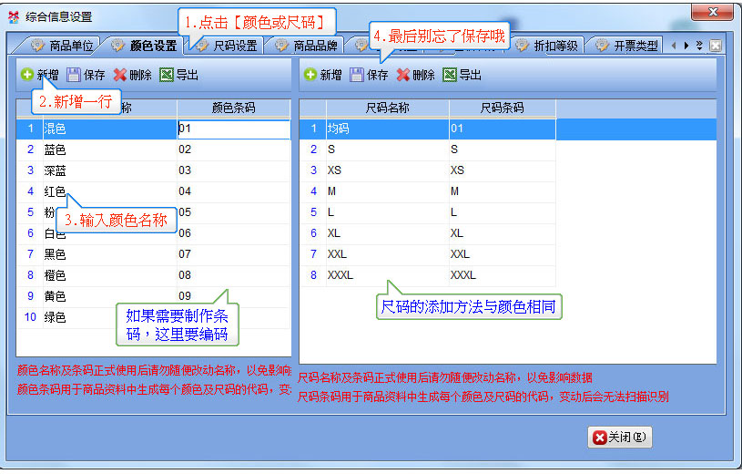 第2步:建立顏色尺碼數據,建立好顏色尺碼后可以在建商品資料時選擇相應的顏色與尺碼,【基本信息】--【綜合信息設置】打開如圖所示的窗口