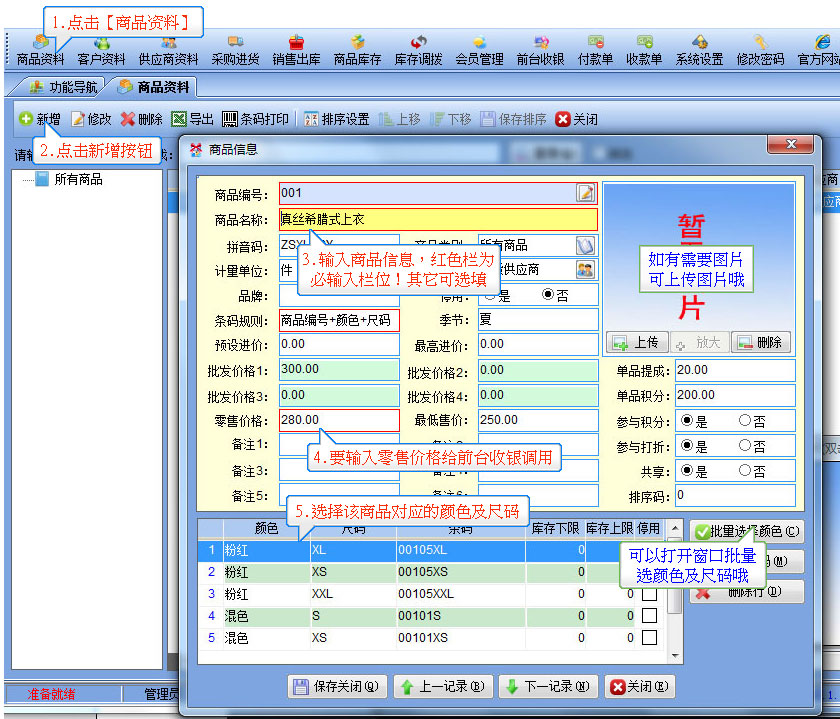 可設置由系統自動生成5位流水號一直遞增下去,也可以取消自動編號后手動號,從系統管理-系統設置,商品自動號取消消即可,推薦用衣服上原來的款號來做編號會更好一些。 |