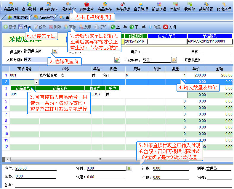 該單貨物從哪個供應商處購買,相對應的欠款等也會自動增加到該供應商上。 |
