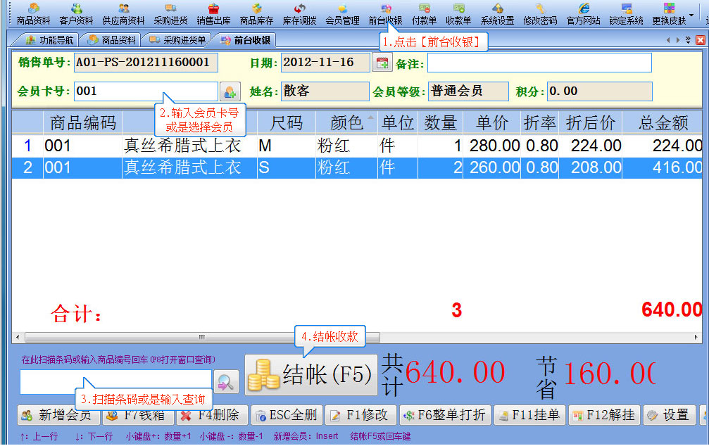 第10步:前臺收銀,對會員的零售可用前臺收銀,收銀和客戶的銷售出庫是完全兩個獨立的模塊,會員只能收現金不能用于欠款銷售,并不能修改已收銀過的單據,只能做廢,直接點擊工具欄上前臺收銀按鈕打開如圖所示的窗口
