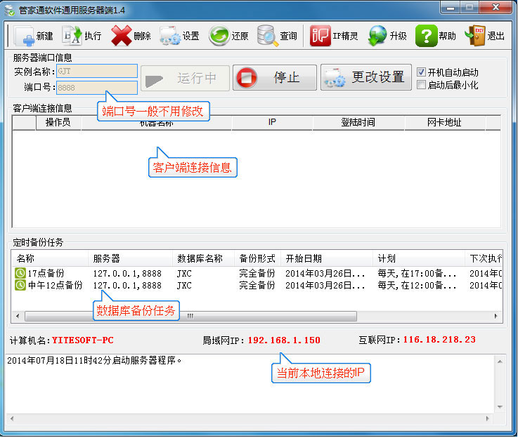管家通軟件只需要簡單的兩步即可完成局域網版的設置,選一臺機做主機,安裝好服務器端和客戶端,先打開服務器端軟件后做如下設置。