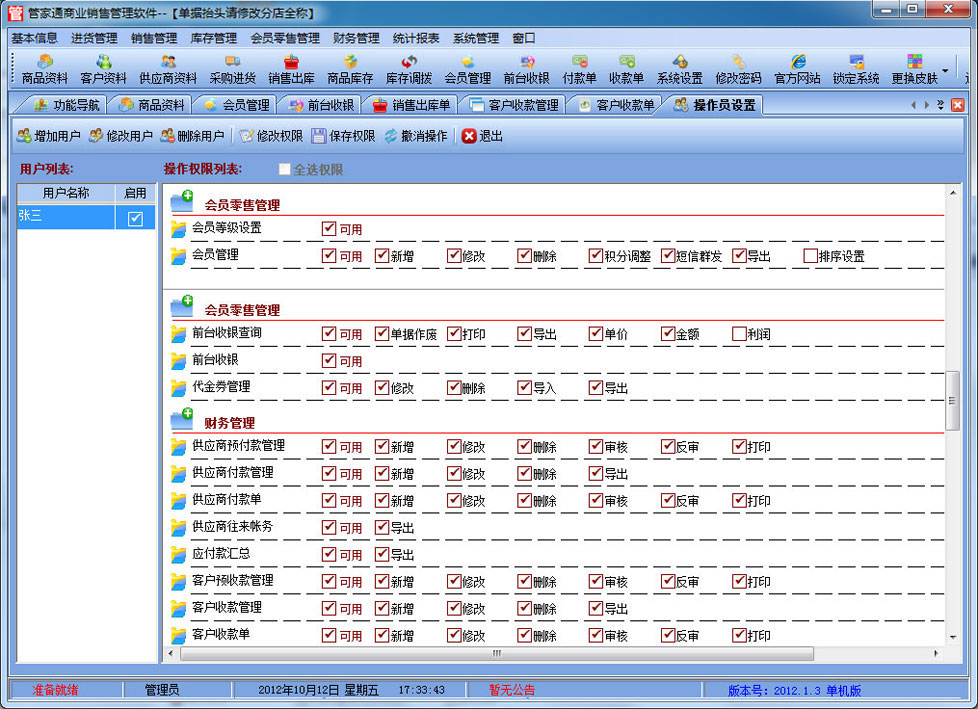 管家通商業銷售管理系統是一款專業的銷售管理軟件,其中包含商品銷售管理系統 ,庫存管理系統(倉庫管理系統),財務和報表系統等子模塊。軟件界面設計簡潔,美觀,其人性化的軟件流程,使普通用戶不需培訓也能很快掌握軟件操作使用方法,上手極易。強大報表與集成查詢功能是本軟件的最大特色,所有功能在用戶需要的使用地方自然體現,不用打開多個窗口重復查詢。適用于商貿公司,個體門店等用于商業銷售管理, 庫存管理,財務管理等,客戶管理,員工管理等場合,是您企業進行信息化管理的強大工具。 二、增強功能:分店獨立成本價,分店銷售定價管理、分店數據和共享功能、會員管理、前臺收銀,短信群發 三、連鎖功能:可單店用,多店用,基本資料可共享或私有化(即同一個商品及客戶是否其它店面可用) ,門店間調撥,分門店設置商 品的售價(即不同門店使用不同的銷售價格),分門店設置商品的最高庫存與最低庫存并可以分門店自動顯示庫存報警等。 四、軟件特色: 1、支持POS銷售。可以根據需要選配打印機、讀卡器、會員卡、條碼槍、錢箱、顧客顯示屏及小票打印機;可以根據自已喜好設計各 種有特性的打印格式。銷售時可以適時掌握每一個商品的當前庫存數,銷售成本、銷售毛利; 2、支持會員管理。可設置會員級別,不同級別可以適用不同的價格與折扣.可以自動計算會員的累計消費、累計積分、兌現積分及剩余 積分情況。過生日的會員可自動提醒; 3、支持設置商品的"最低售價"功能,銷售時若單價低于"最低售價"則不允許銷售; 4、在選擇商品時可以多選,即可以一次可以選擇多個商品; 5、可以設置單價、數量及銷售金額的核算精度即設置小數點位數; 6、可以適時顯示往來單位(供貨商,客戶)的應收帳款、應付帳款、預收帳款、預付帳款; 7、可以實現預收款沖應收款、預付款沖應付款;可以按單據結算應收帳款、應付帳款; 8、可以生成商品售價(批發價零售價會員價售價一至五)的生成幅度,售價可自動生成,減輕了定價的工作量; 9、員工提成方式多樣,可針對每個商品設置提成兩種提成三種方式:單品提成,銷售額提成率及銷售毛利提成率,員工的業績及提成 一目了然; 10、無處不在的顯示商品圖片的功能.支持圖片存放數據庫中,也可以存放軟件目錄文件夾中; 11、支持手工盤點(直接輸入需要盤點的商品)、自動盤點(直接按商品類別提取庫存)及盤點機盤點; 12、權限設置功能強大.可以設置每個員工的菜單操作權、單據操作權、分店操作權及其他操作權限{比如:查看成本權(即能不能看到 進價及毛利)、售價調整權(即能不能在銷售時修改售價及折扣)等}; 13、支持數據導入導出(比如:從其它軟件中導入期初庫存,商品資料,客戶,供應商,會員等...... 14、 所有單據支持自定義設計格式、打印前預覽,并且可以導出為Excel文件,然后根據您的實際需要進行特別編排處理; 15、功能強大的各類統計報表,為您提供詳盡的營業報告,讓您對商品進、銷、存及利潤等財務狀況了如指掌; 16、支持自動上傳下載數據及斷網重連功能。大大方便了在網絡不穩定的情況下使用本軟件; 17、升級智能化。您只需輕點鼠標,便可通過互聯網實現軟件的升級,免除您升級之苦。 |